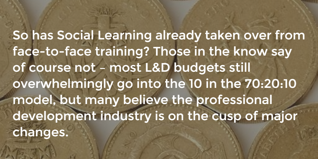 The rise of the internet and social media has meant that instead of a didactic, trainer led environment, most people seek out their own knowledge and skills development when they require it, and when they can’t find it themselves, they crowdsource, naturally utilising the ideals of Social Learning. So has Social Learning already taken over from face-to-face training? Those in the know say of course not – most L&D budgets still overwhelmingly go into the 10 in the 70:20:10 model, but many believe the professional development industry is on the cusp of major changes. After all, where the money goes, the professionals follow, and research continually suggest that focusing on alternatives to face-to-face promises greater retention, higher levels of engagement and a more profitable ROI.