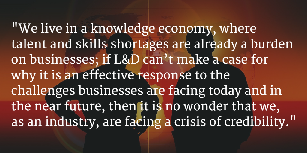 Learning and Development should be seen as the key to present and future business success, not as a drain on an organisation’s bottom line. If L&D is not relevant, business focused, and up to date, then it is no wonder that organisations are not giving L&D the resources or the credit it deserves. We live in a knowledge economy, where talent and skills shortages are already a burden on businesses; if L&D can’t make a case for why it is an effective response to the challenges businesses are facing today and in the near future, then it is no wonder that we, as an industry, are facing a crisis of credibility.