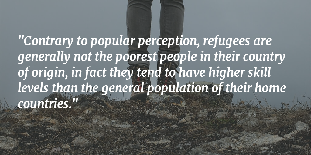 Contrary to popular perception, refugees are generally not the poorest people in their country of origin, in fact they tend to have higher skill levels than the general population of their home countries. Statistics Sweden reported in 2014 that more than 40% of Syrians in the country had at least upper secondary education, and self-reporting in Germany found that in that same year 15% of total refugees had tertiary degrees (Syrian’s reported a level of 21% who had attended university), while 16% had upper secondary education (again, Syria exceeded these levels at 22%). Furthermore, France reported that 14% of refugees held university degrees, while 43% had secondary education. (1)